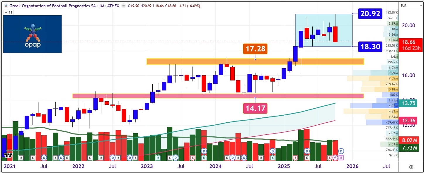 Τέλος από απόψεως διαγραμματικής ανάλυσης η μετοχή του ΟΠΑΠ συνεχίζει για πάνω από 150 μέρες να λαμβάνει τιμές μέσα στο εύρος διακύμανσης των €20,92 με €18,30. Οποιαδήποτε επιβεβαιωμένη διάσπαση του πλαγιοσταθεροποιητικού σχηματισμού θα σημάνει και την απαρχή μιας νέας τάσης.
