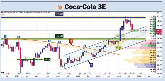 Παράλληλα το Q3 2025 κατέγραψε οργανική αύξηση εσόδων 5% και όγκου 1,1%, με κινητήριους άξονες τα ανθρακούχα και τα ενεργειακά ποτά. Παρά την πρόσκαιρη αύξηση μόχλευσης, οι Citi και Jefferies διατηρούν θετική στάση με τιμές-στόχους τα 46 και 50,6 ευρώ αντίστοιχα, αναγνωρίζοντας τη στρατηγική υπεραξία της αφρικανικής επέκτασης. Από διαγραμματικής απόψεως η μετοχή ακουμπάει πάνω στη στήριξη που παρέχει το κανάλι "C" στα 39,30 ευρώ δίνοντας ενδείξεις πατήματος και ανοδικής κίνησης προς τα 44 ευρώ.