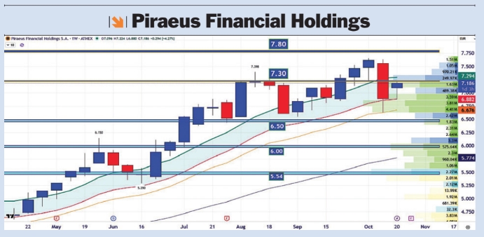Η ποιότητα του ενεργητικού παραμένει ισχυρή, ενώ η διοίκηση αναμένεται να επαναβεβαιώσει το χρονοδιάγραμμα ολοκλήρωσης της εξαγοράς της Εθνικής Ασφαλιστικής έως το τέλος του έτους. Η Optima διατηρεί τη μετοχή Πειραιώς ως κορυφαία επιλογή στον κλάδο, με τιμή-στόχο 7,50 ευρώ και αποτίμηση 1,07x P/TBV και 7,8x P/E 2026. Τεχνικά η μετοχή αποτυπώνεται στο εβδομαδιαίο chart τιμών να θέλει να προσπεράσει τα 7,30 ευρώ, ώστε να πατήσει γκάζι για τα 7,80.