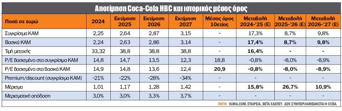 Καταλήγοντας, η εξαγορά της Coca-Cola Beverages Africa (CCBA) μεταμορφώνει στρατηγικά την Coca-Cola HBC, ανεβάζοντας τα pro forma έσοδα στα 14,1 δισ. ευρώ και το EBIT στα 1,44 δισ. ευρώ (2024). Με εκτιμώμενο EBITDA περίπου 2 δισ., ο συνδυασμένος όμιλος αποτιμάται σε EV/EBITDA περί τις 8 φορές και P/E 2025 περίπου 16 φορές, επίπεδα που θεωρούνται ελκυστικά για εταιρεία με προβλεπόμενη διψήφια αύξηση οργανικών EBITDA και θετικό EPS accretion από το 2027.