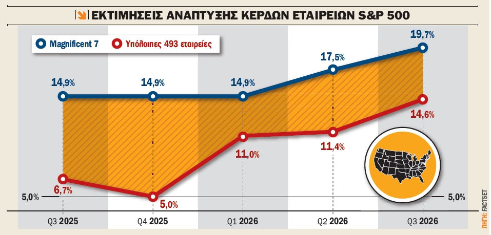 Κοιτάζοντας προς το μέλλον, οι εκτιμήσεις της αγοράς κάνουν λόγο για επιτάχυνση της κερδοφορίας τόσο για τις "Magnificent 7" όσο και για το υπόλοιπο της αγοράς, με εκτιμώμενους ρυθμούς ανάπτυξης έως και 19,7% για την περίοδο δ’ τρίμηνο 2025 έως και γ’ τρίμηνο 2026. Η εξέλιξη αυτή υποδηλώνει μια σταδιακή εξισορρόπηση μεταξύ των τεχνολογικών "γιγάντων" και των παραδοσιακών κλάδων, πράγμα το οποίο μπορεί να διατηρήσει τους ρυθμούς ανάπτυξης κερδών για τον S&P 500, διατηρώντας έτσι και τις αποτιμήσεις σε υψηλά επίπεδα!