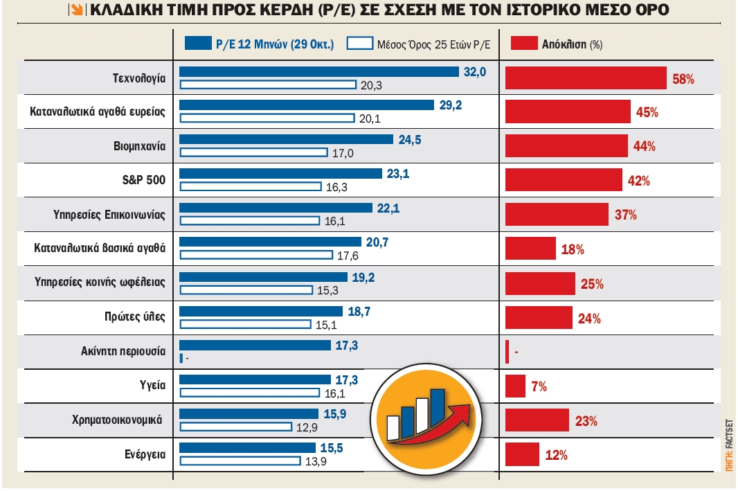 Η ανοδική πορεία του λόγου P/E δεν περιορίζεται σε επίπεδο S&P μόνο. Όλοι οι κλαδικοί δείκτες του S&P 500 εμφανίζουν P/E υψηλότερο από τον μέσο όρο των τελευταίων 25 ετών (δεν υπάρχουν στοιχεία για την ακίνητη περιουσία). Ξεχωρίζουν η τεχνολογία με 32,0 έναντι 20,3 του 25ετούς μ.ό., τα αγαθά ευρείας κατανάλωσης με 29,2 έναντι 20,1 του 25ετούς μ.ό. και η βιομηχανία με 24,5 έναντι 17,0 του μέσου όρου των τελευταίων 25 ετών. Η έντονη άνοδος στις τεχνολογικές μετοχές και στις εταιρείες υψηλής ανάπτυξης αποτελεί καθοριστικό παράγοντα στην κίνηση αυτή.