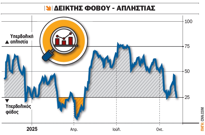 Οι διεθνείς χρηματιστηριακές αγορές συνεχίζουν να κινούνται ανοδικά, όμως "κάτω από την επιφάνεια" διαμορφώνεται μια περίπλοκη και εν μέρει ανησυχητική εικόνα. Ένα πέπλο αχλύος* σκεπάζει το επενδυτικό τοπίο, καθώς η αγορά δείχνει ισχυρή στην κορυφή αλλά εύθραυστη στη βάση της. Ο δείκτης fear - greed Index (δείκτης φόβου-απληστίας, βρίσκεται στο 26 με εύρος 1-100), ένας από τους κορυφαίους δείκτες ψυχολογίας αγορών, δείχνει ότι το επενδυτικό συναίσθημα κυριαρχείται από "φόβο", ενώ βρισκόμαστε στο 2%-3% από τα ιστορικά υψηλά για τον δείκτη S&P 500! Μια σπάνια περίπτωση στα χρονικά των αγορών!