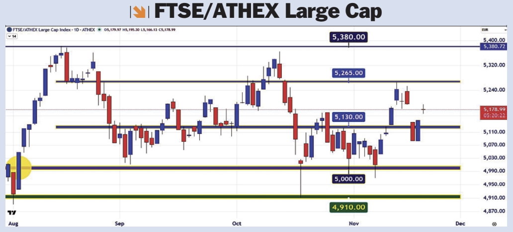 Ο δείκτης της υψηλής κεφαλαιοποίησης FTSE/ATHEX Large Cap κρατά τη στήριξη των 5.025 με 4.985  μονάδων και δείχνει ότι η περιοχή 5.130 με 5.265 είναι το επόμενο πεδίο βραχυχρόνιας ισορροπίας, όπου θα δώσει το ανοδικό πάτημα για τις 5.380.