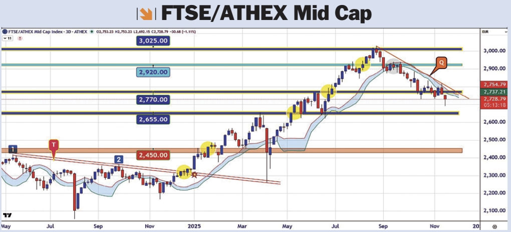 Στον δείκτη της μεσαίας κεφαλαιοποίησης FTSE/ATHEX Mid Cap, η περιοχή των 2.655 παραμένει κρίσιμη, καθώς η αγορά ψάχνει μια σταθερή βάση πριν από την ανοδική διάλυση της καθοδικής γραμμής "Q" και τη μετάβαση σε υψηλότερες αποτιμήσεις. Πάντως, όλο το τεχνικό αφήγημα δείχνει μια αγορά που μαζεύει ενέργεια και  όχι μια αγορά που εξαντλείται.
