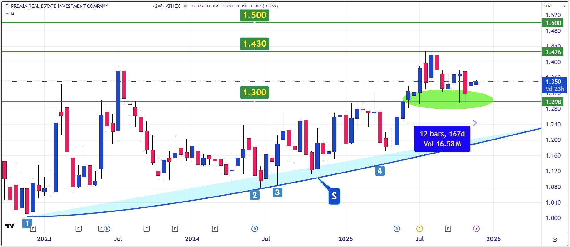 Διαγραμματικά τώρα η μετοχή έχει σχηματίσει μια ισχυρή βάση αγοραστών ανάμεσα στα €1,33 με €1,35, όπου εδώ και 167 μέρες έχουν σκουπίσει ότι πέφτει μέσα σε αυτή τη ζώνη. Οπωσδήποτε αυτό το μάζεμα σε κάποια στιγμή θα δώσει μια εκρηκτική κίνηση που θα βγει πάνω από το φράχτη των €1,50.