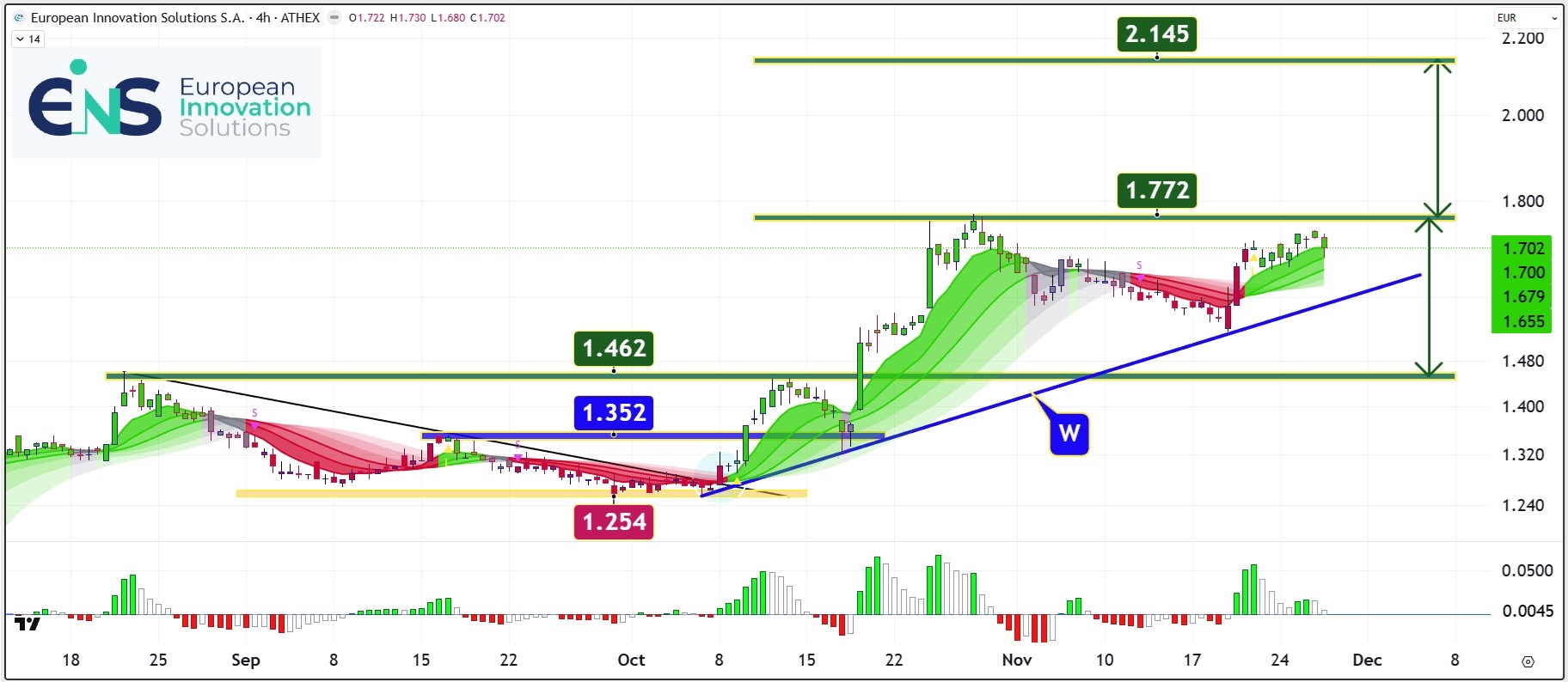 Από απόψεως τώρα διαγραμματικής ανάλυσης… η μετοχή μετά την ανοδική διαφυγή πάνω από το επίπεδο των €1,462 έχει βρεθεί στο κατώφλι των €1,77 με €1,80 και ετοιμάζεται να το διαβεί και αυτό με τον επόμενο στόχο να εντοπίζεται στην περιοχή των €2,145 με €2,20.