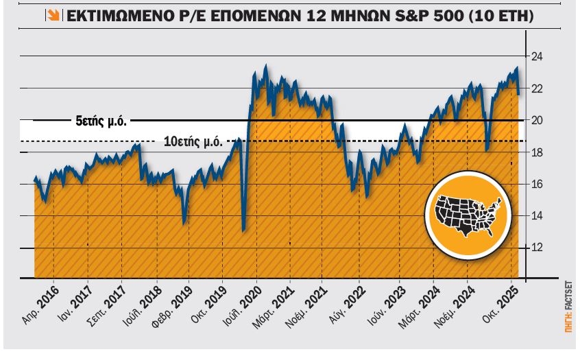 Στο μέτωπο των αποτιμήσεων, ο S&P 500 εξακολουθεί να κινείται σε υψηλότερα επίπεδα από τον ιστορικό μέσο όρο. Ο λόγος τιμή προς κέρδη (εκτιμώμενα κέρδη επόμενων 12 μηνών) P/E διαμορφώνεται στις 21,5 μονάδες, ήτοι 15% υψηλότερα από τον μέσο όρο δεκαετίας (18,7), αλλά χαμηλότερα από τις 22,8 φορές που είχε καταγραφεί στο τέλος Σεπτεμβρίου.