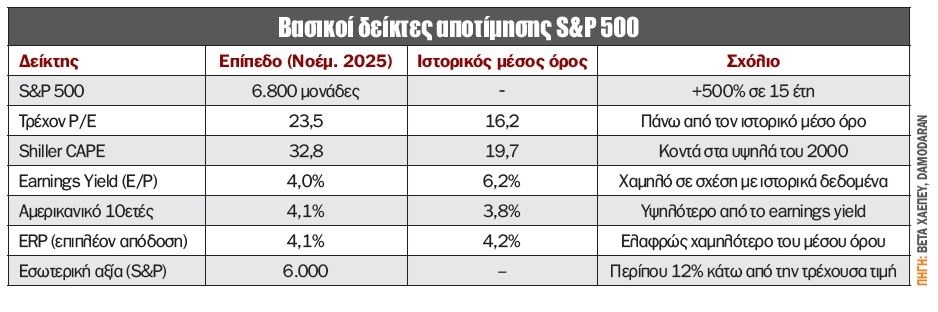 Αν συγκριθεί με τον ιστορικό μέσο όρο ERP 4,25% (1960-2024), η αγορά φαίνεται μέτρια υπερτιμημένη. Με βάση αυτό το σενάριο, η "δίκαιη" αξία του δείκτη εκτιμάται περί τις 6.000 μονάδες, ήτοι αρκετά χαμηλότερα από τα τρέχοντα επίπεδα.