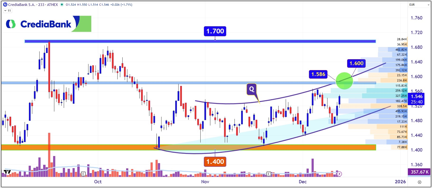 Από απόψεως διαγραμματικής ανάλυσης μεγάλο ενδιαφέρον παρουσιάζει το αποτυπωμένο ανοδικό κανάλι "Q” που έχει διαμορφωθεί στο χρονικό Fibonacci chart των 233 λεπτών με τη μετοχή της CrediaBank να δείχνει έτοιμη να έρθει σε αντιπαράθεση με το άνω μέρος του στα €1,60 με €1,586. Πιθανή ανοδική διάτρηση θα οδηγήσει τη μετοχή σε νέα ιστορικά υψηλά πάνω από τα €1,70 και προς τα €1,84. Ο στόχος φυσικά παραμένει το επίπεδο διέλευσης των €2,00.
