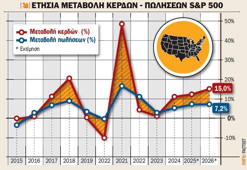 Οι εκτιμήσεις της αγοράς (σε ετήσια βάση) για τον ρυθμό αύξησης κερδών του 2026 για τις εταιρείες που απαρτίζουν τον S&P 500 ανέρχονται στο 15%, ποσοστό υψηλότερο από τον μέσο ετήσιο ρυθμό αύξησης κερδών της τελευταίας 10ετίας, που δεν ξεπερνά το 8,6% (2015-2024).
