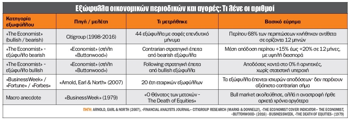 Παρότι ο μύθος "η κατάρα του εξωφύλλου" παραμένει ισχυρός, οι αριθμοί είναι πιο σύνθετοι. Εμπειρικές αναλύσεις, όπως αυτή της Citigroup για τα εξώφυλλα του "Economist", δείχνουν ότι περίπου δύο στα τρία covers λειτούργησαν εκ των υστέρων ως contrarian σε ορίζοντα ενός έτους.