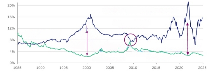Στο γράφημα αποτυπώνεται μια σχέση που θα έπρεπε να ανησυχεί κάθε επενδυτή: οι υποκειμενικές προσδοκίες απόδοσης κορυφώθηκαν το 2000 και το 2021 – δύο χρονιές κατά τις οποίες οι αποτιμήσεις είχαν εκτοξευθεί και ο κυκλικά προσαρμοσμένος δείκτης τιμή προς κέρδη (CAPE) βρισκόταν σε εξαιρετικά υψηλά επίπεδα.