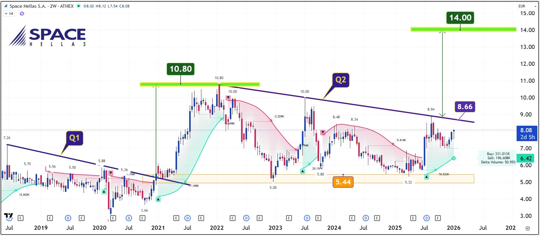 Από απόψεως διαγραμματικής ανάλυσης έχουμε επισημάνει και σε προηγούμενες αναλύσεις τη σημαντικότητα της μακροπρόθεσμης γραμμής τάσης "Q2” που πιέζει τη μετοχή για περίπου μια τετραετία. Η ανοδική διάσπαση της εν λόγω γραμμής στα €8,66 θα ανοίξει το έδαφος για να την μεσοπρόθεσμη ανοδική κίνηση της μετοχής προς το επόμενο επίπεδο αντιπαράθεσης των €14 ή ένα +75% από τα τωρινά επίπεδα τιμών.