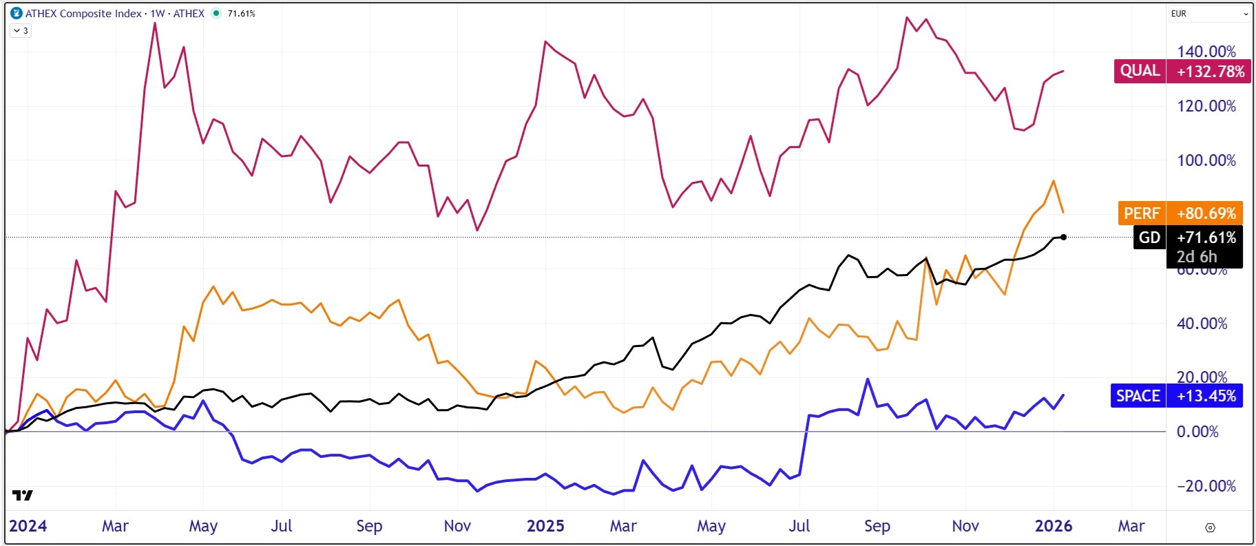Στο διάγραμμα από τις αρχές του 2024 έως σήμερα καταγράφεται μια έντονη υστέρηση που δεν συμβαδίζει με τα μεγέθη. Η μετοχή της Space Hellas εμφανίζει σωρευτική άνοδο περίπου +13,5%, όταν η Performance Technologies κινείται στο +80,7%, η Quality & Reliability στο +132,8%, ενώ ο Γενικός Δείκτης του ATHEX Euronext βρίσκεται στο +71,6%.