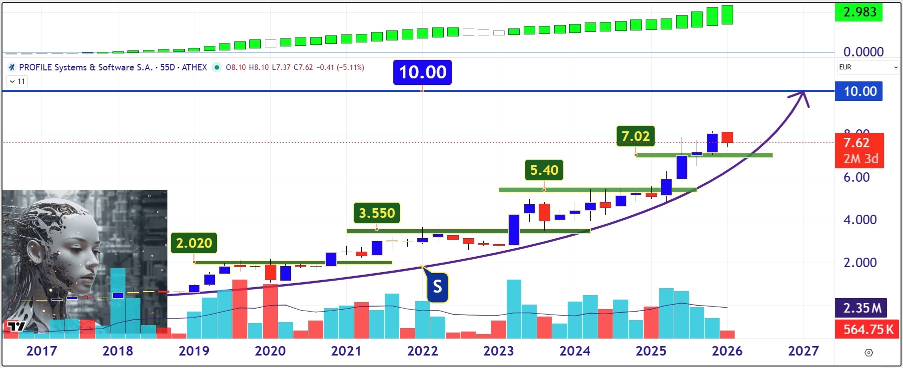 Από πλευράς διαγραμματικής ανάλυσης δεν έχω και πολλά πλέον να πώ μιας που εδώ και πολλά χρόνια ο δρόμος της ανόδου έχει χαραχτεί από τον μακροπρόθεσμο στροφέα "S” που μπορεί να φέρει τη τιμή της μετοχής πάνω από τα €10 και πρός τα €12.