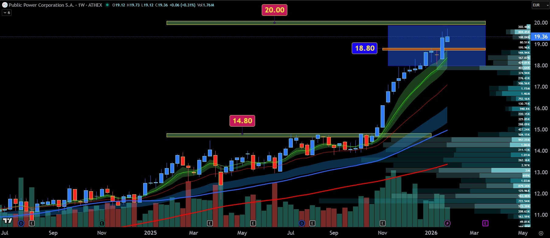 Η περιοχή των 20,00 ευρώ έχει αρχίσει και συγκεντρώνει τα βλέμματα καθώς αν τμηθεί ανοδικά με αυξημένο όγκο συναλλαγών θα ανοίξει το έδαφος για τιμές μέσα στο εύρος των 22 με 23 ευρώ.