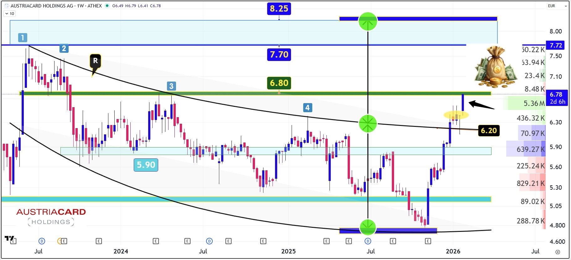 Χαρακτηριστικό είναι επίσης και το "μάζεμα” της μετοχής που έχει πραγματοποιηθεί από ισχυρά θεσμικά χέρια στην περιοχή των 5,20 με 5,50 ευρώ των ατυχών μεγάλων πωλήσεων που είχαν γίνει στα 6,08 με 5,75 ευρώ. Τώρα μάλιστα φαίνεται να δημιουργείται μια νέα κρίσιμη μάζα αγοραστών στην περιοχή των 6,30 με 6,70 ευρώ στοιχείο που θα φέρει ψηλότερα την τιμή της μετοχής.