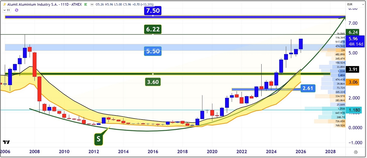 Ανοδική πορεία προς τα επίπεδα που είχε καταγράψει τον Ιούλιο του 2007, στα €6,22, έχει αρχίσει να χαράζει η μετοχή της ALUMIL (ΑΛΜΥ), μετά και την κίνηση των τελευταίων συνεδριάσεων. Ένα σταθερό πέρασμα πάνω από τη ζώνη των €6 ανοίγει πλέον τον ανηφορικό δρόμο, όχι τόσο προς το στόχο των υψηλών σχεδόν δύο δεκαετιών, όσο προς το επόμενο επίπεδο αντιπαράθεσης στην περιοχή των €7,50.