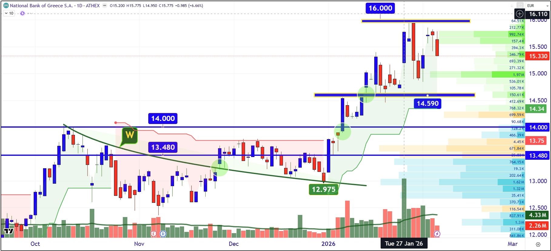 Στο ημερήσιο διάγραμμα της Εθνικής Τράπεζας, η μετοχή έχει αρνηθεί τρεις φορές να περάσει πάνω από το επίπεδο των 16 ευρώ, με αποτέλεσμα να παλινδρομεί για περίπου οκτώ συνεδριάσεις γύρω από τη βάση των 15,10 – 14,90 ευρώ. Διάσπαση αυτής της κίνησης προς τα κάτω θα ωθήσει τη μετοχή προς το βασικό αμυντικό επίπεδο των 14,68 – 14,59 ευρώ, περιοχή που αν χαθεί θα φέρει τιμές κάτω και από τα 14 ευρώ. Το καθοδικό αυτό σενάριο δεν ενεργοποιείται όσο η μετοχή δείχνει αδυναμία διαφυγής κάτω από τα 14,90 ευρώ. Σε αυτή την περίπτωση, οι αγοραστές θα επιχειρήσουν εκ νέου κίνηση προς τα 16 ευρώ, με πιθανή συνέχεια προς τα 17,40 ευρώ. Τα αποτελέσματα του 2025 ανακοινώνονται στις 27 Φεβρουαρίου.