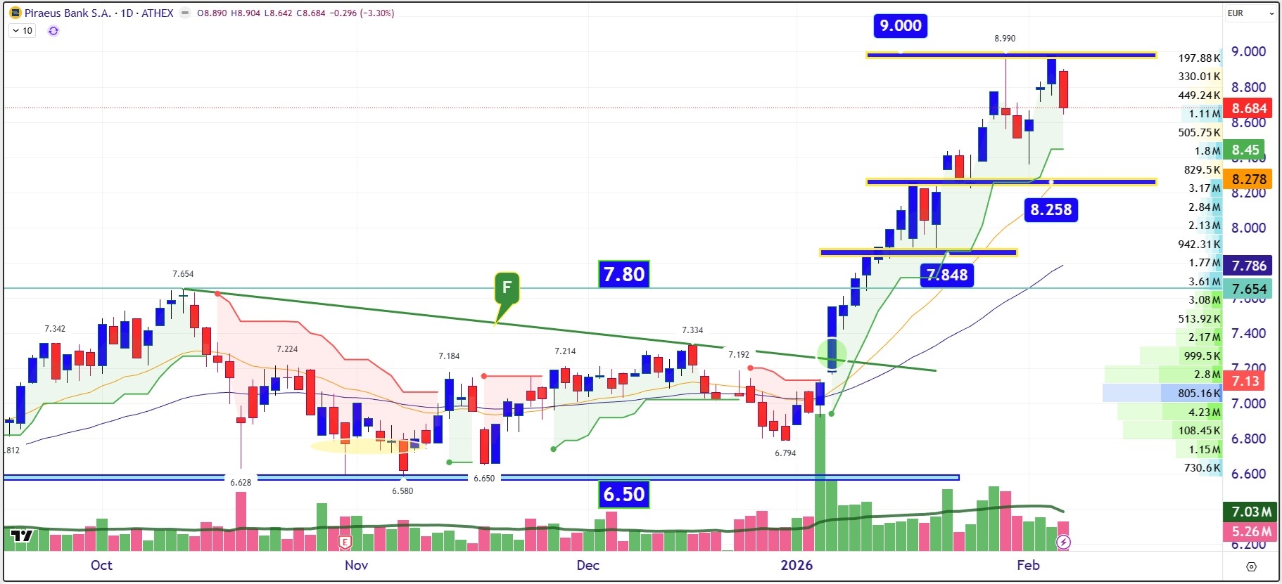 Η Τράπεζα Πειραιώς προσέγγισε με ένταση τα 9 ευρώ, για να ακολουθήσει pullback με στόχο την ανάκτηση δυνάμεων προς τη ζώνη 8,54 – 8,46 ευρώ. Πρόκειται για επίπεδο που δεν θα πρέπει να παραβιαστεί, καθώς σε αντίθετη περίπτωση ανοίγει ο δρόμος για κίνηση προς τα 8,26 – 8,20 ευρώ και στη συνέχεια προς τη σκληρή ζώνη στήριξης των 7,85 ευρώ. Αντίθετα, σταθερό πάτημα πάνω από τα 8,46 ευρώ θα επαναφέρει τους αγοραστές με αυξημένες δυνάμεις προς τα 9 ευρώ, με ό,τι αυτό συνεπάγεται για την προσπάθεια καταγραφής διψήφιας τιμής στο επόμενο χρονικό διάστημα. Τα οικονομικά αποτελέσματα αναμένονται στις 26 Φεβρουαρίου.