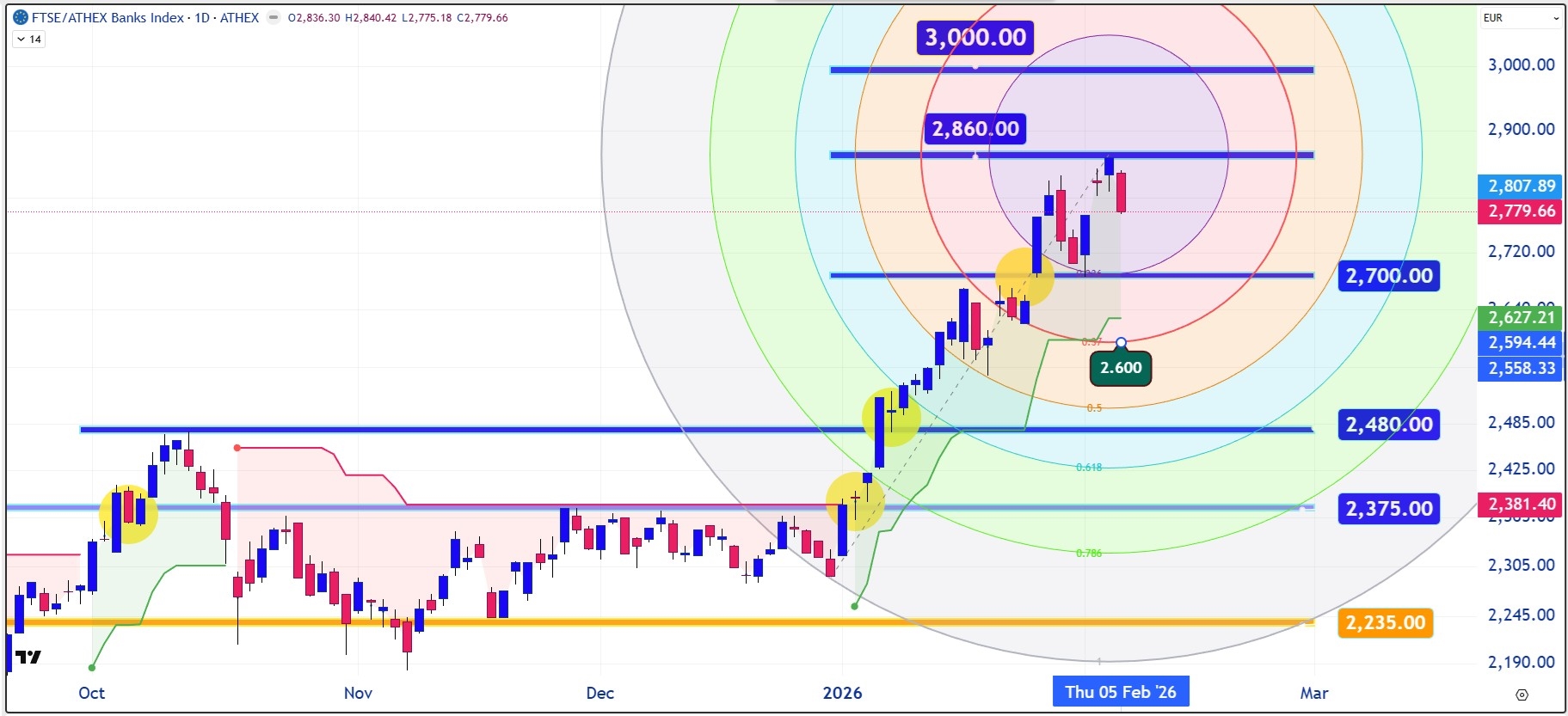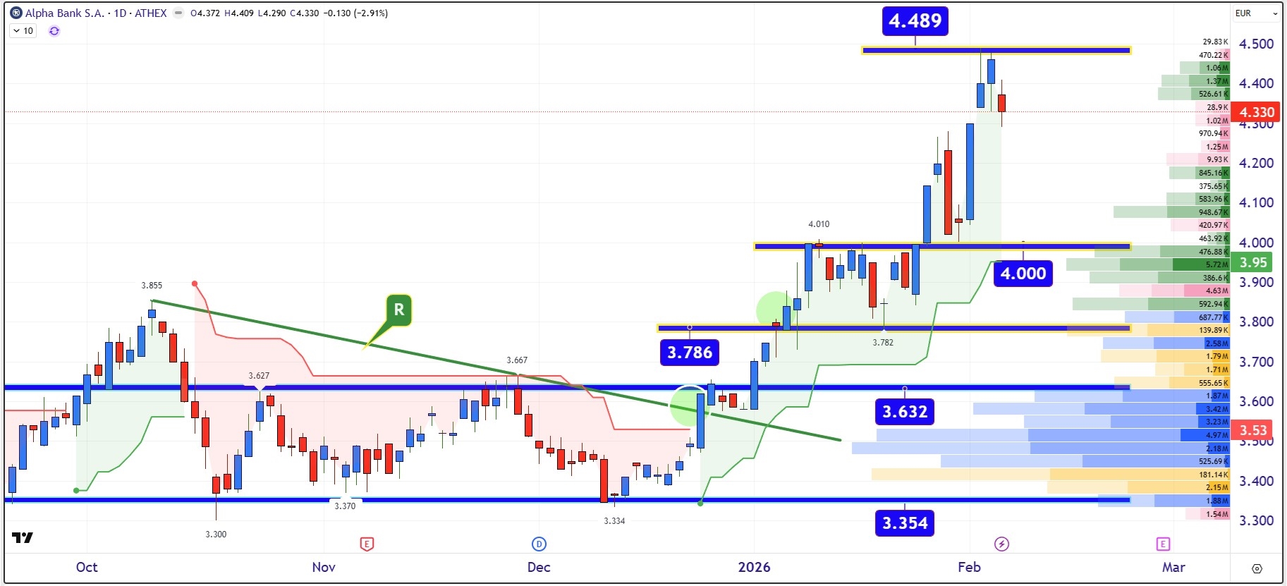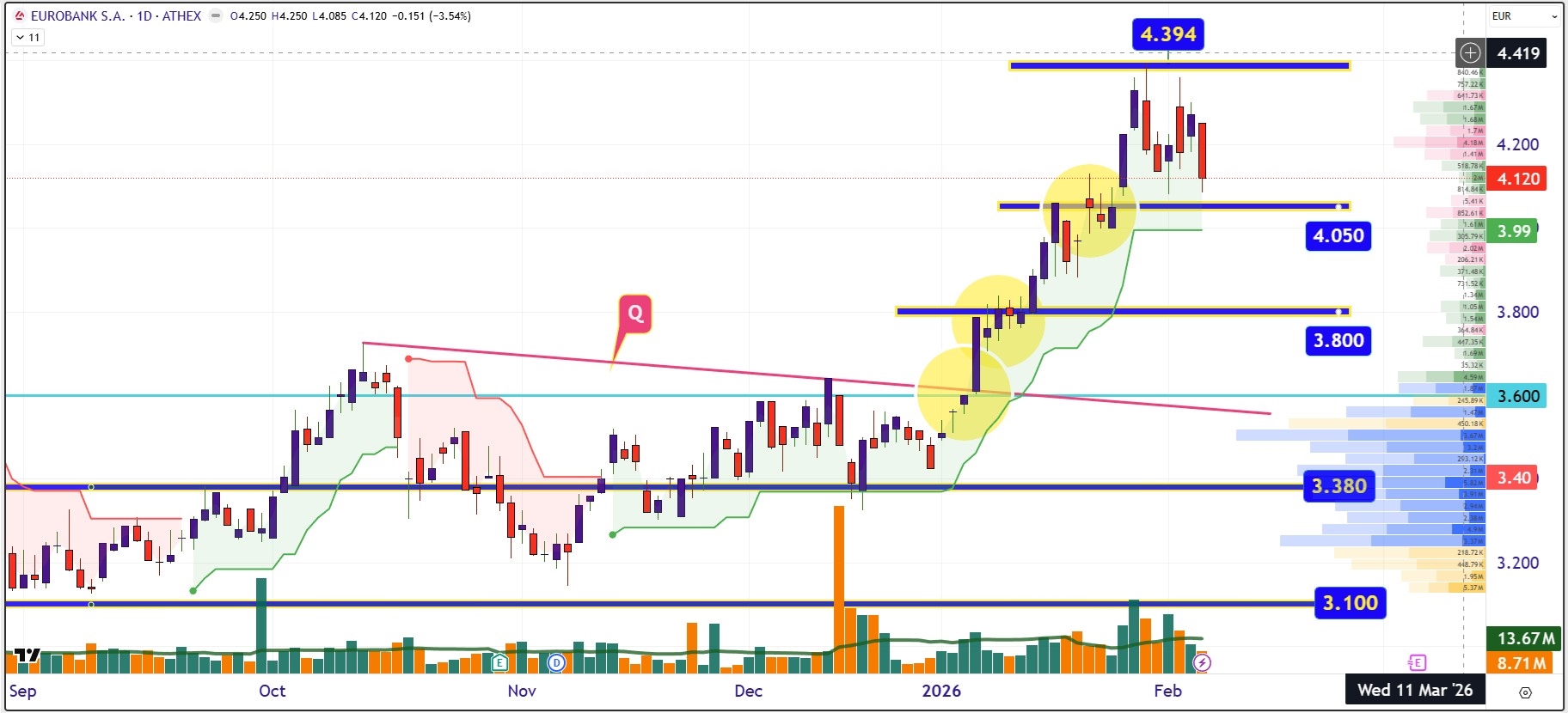 Στις επιμέρους τραπεζικές μετοχές, η Eurobank κινείται στο ημερήσιο γράφημα για έβδομη συνεδρίαση μέσα στο εύρος 4,394 – 4,050 ευρώ, χωρίς μέχρι στιγμής απόδραση. Κρίσιμο σημείο αποτελεί η ζώνη 4,05 – 4,00 ευρώ, η οποία δεν θα πρέπει να παραβιαστεί καθοδικά, καθώς κάτι τέτοιο θα αλλάξει τη βραχυπρόθεσμη διάθεση της μετοχής και θα ανοίξει τον δρόμο προς τα 3,88 ευρώ. Αντίθετα, άρνηση απώλειας των 4 ευρώ επαναφέρει τη μετοχή στην τροχιά των υψηλών με επόμενο στόχο τα 4,80 ευρώ. Τα οικονομικά αποτελέσματα για τη χρήση του 2025 ανακοινώνονται στις 26 Φεβρουαρίου.