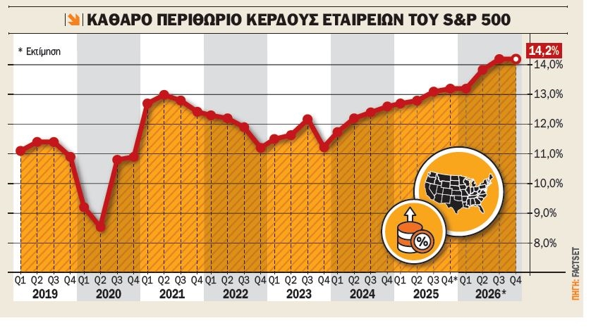 Τέλος, κοιτάζοντας προς το μέλλον οι εκτιμήσεις της αγοράς κάνουν λόγο για περαιτέρω βελτίωση του καθαρού περιθωρίου κέρδους για το δείκτη S&P 500 για το 2026. Σύμφωνα με τις τρέχουσες προβλέψεις, το καθαρό περιθώριο κέρδους εκτιμάται σε 13,2% το α’ τρίμηνο 2026, 13,8% το β’ τρίμηνο, 14,2% τόσο το γ’ όσο και το δ’ τρίμηνο του 2026!!