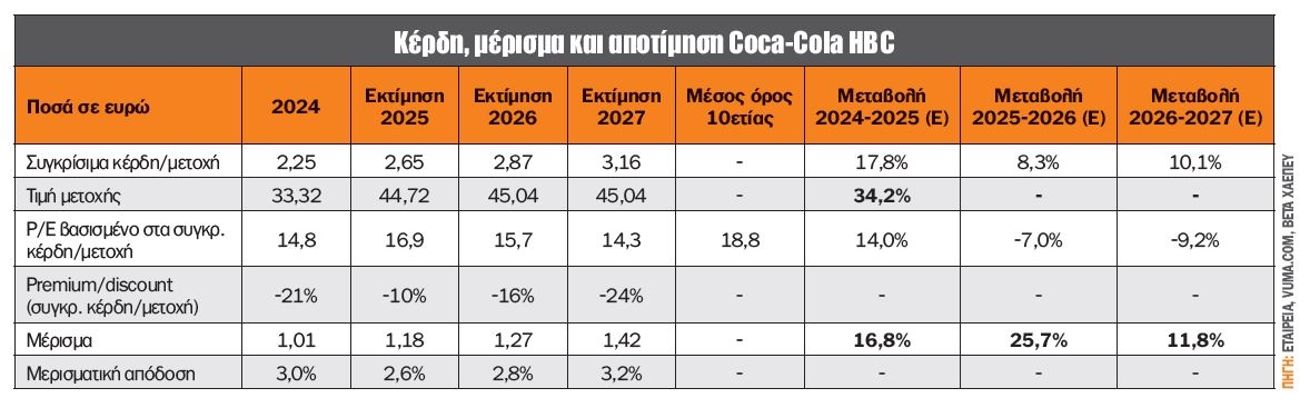 Καταλήγοντας και σύμφωνα με τις εκτιμήσεις της αγοράς (Bloomberg), η Coca-Cola HBC διαπραγματεύεται περί τις 10 φορές τα εκτιμώμενα EBITDA του 2025 και 9,4 φορές του 2026 σύμφωνα με τον δείκτη EV/EBITDA. Ταυτόχρονα, σε επίπεδο καθαρών κερδών το P/E της Coca-Cola HBC προσεγγίζει τις 16,9 φορές για το 2025, ενώ για το 2026 ο δείκτης υποχωρεί στις 15,7 φορές! Η μετοχή διαπραγματεύεται με έκπτωση που αγγίζει το 10% για τα εκτιμώμενα κέρδη του 2025 με βάση τον 10ετή μέσο όρος της. Μην ξεχνάτε ότι η ιστορία δεν επαναλαμβάνεται, αλλά συχνά κάνει ομοιοκαταληξία!