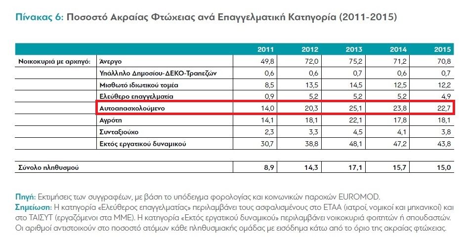Τα προηγούμενα οικονομικά στοιχεία επιβεβαιώνει και νεότερη μελέτη για τη φτώχεια – το καλοκαίρι του 2016 - από τον ανεξάρτητο οργανισμό έρευνας και ανάλυσης "διανέοσις", σύμφωνα με την οποία αυξημένα ποσοστά ακραίας φτώχειας παρουσιάζουν τα νοικοκυριά με αρχηγό αυτοαπασχολούμενο (22,7%) , σε σχέση με τις άλλες κατηγορίες, με στοιχεία για το διάστημα 2011 – 2015 κι είναι το τρίτο κατά σειρά ποσοστό μετά τους άνεργους (70,8% ) και όσους είναι εκτός εργατικού δυναμικού(43,8%).