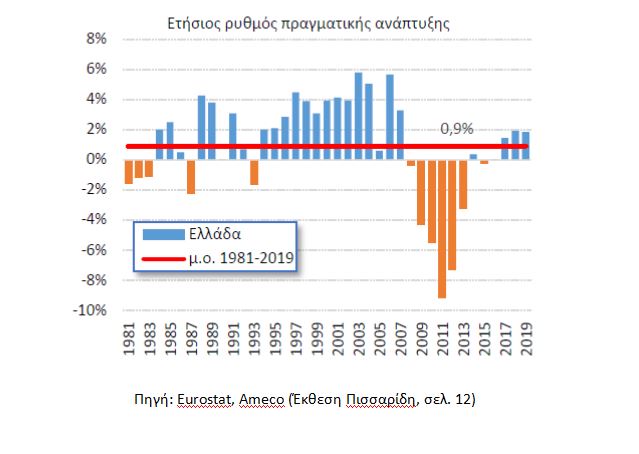 Όπως δεν μπορεί ν’ αποφύγει να μας αποκαλύψει και ποιος αναπτυξιακός στόχος θα είναι κατά την άποψή της επιτεύξιμος αν υλοποιηθεί το σχέδιό της. Στο σημείο αυτό, η Έκθεση έρχεται αντιμέτωπη με την μητέρα των προκλήσεων: με ποιο τρόπο θα ξεκολλήσει την πραγματική ανάπτυξη της οικονομίας τα επόμενα χρόνια, από το 1% που έχει κατά μέσο όρο καταγράψει ετησίως τα τελευταία 40 χρόνια! Για να καταστεί και το χρέος μας βιώσιμο. Διότι, όσοι αντιτίθενται στην άποψη περί βιωσιμότητας του χρέους μας μακροπρόθεσμα, προβάλλουν ότι η πραγματική ανάπτυξη στην Ελλάδα τις δυο επόμενες δεκαετίες δεν θα υπερβεί το 1% κατά μέσο όρο. Και μέχρι στιγμής, δικαιώνονται. Μπορεί να τους διαψεύσει το σχέδιο Πισσαρίδη; The odds are there to beat, που έλεγε κι ο Leonard Cohen.