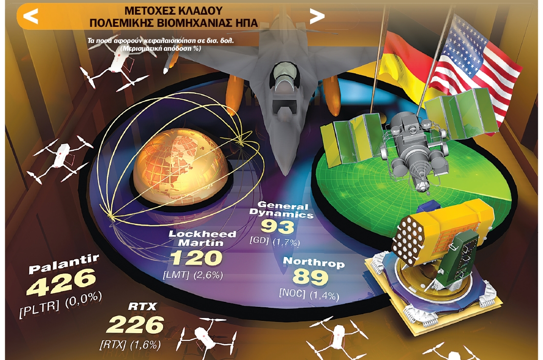 Η παγκόσμια άνοδος των επενδύσεων σε στρατιωτικές υποδομές προφανώς ευνοεί τους μεγάλους εργολάβους των κλάδων που σχετίζονται με την αμυντική βιομηχανία και την αεροδιαστημική, οι οποίοι εξασφαλίζουν τεράστιες και μακροπρόθεσμες κυβερνητικές συμβάσεις για μαχητικά αεροσκάφη, πυραυλικά συστήματα και άλλες αμυντικές τεχνολογίες αιχμής, όπως η τεχνητή νοημοσύνη, η κυβερνοασφάλεια και τα drones. Αυτή η τάση δίνει σημαντική ώθηση στις μετοχές των εν λόγω εταιρειών, με όλο και περισσότερους επενδυτές να αποζητούν έκθεση σε τίτλους όπως οι Palantir, RTX, Rheinmetall και Lockheed. Στις ΗΠΑ, ο S&P Aerospace & Defense Select Industry Index έχει κερδίσει 45% από την αρχή του έτους, υπεραποδίδοντας σημαντικά έναντι του S&P 500 σε αυτό το διάστημα. Η Palantir πέτυχε τριμηνιαία έσοδα άνω του 1 δισ. δολ. για πρώτη φορά στην ιστορία της. Στη Γερμανία η μετοχή της Rheinmetall "πετάει".