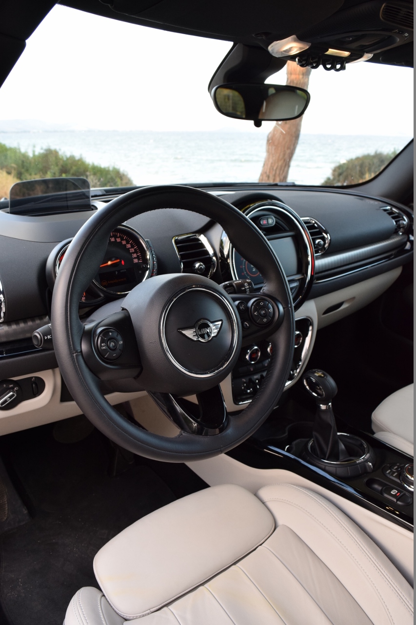 Όλα τα ΜΙΝΙ φημίζονται για το "χαρούμενο” χαρακτήρα μέσα και έξω. Είναι αλήθεια πως βγαίνεις από το σπίτι το πρωί να πας στην δουλεία και με το που το βλέπεις σου φτιάχνει το κέφι. Αυτό συνεχίζεται και μόλις μπεις μέσα. Η σχεδίαση είναι διαφορετική, ξεχωριστή και πολύ χαρούμενη, χωρίς όμως να κουράζει, όπως σε κάθε ΜΙΝΙ. Η μεγάλη όμως διαφορά είναι το πλάτος. Το ταμπλό είναι μεγαλύτερο όπως και η απόσταση μεταξύ των εμπρός επιβατών. Ακόμα καλύτερα, είναι η πρώτη μας σκέψη. Στην θετική εικόνα συμβάλουν και οι ανοικτόχρωμες επενδύσεις των καθισμάτων που κάνουν πιο φωτεινό το εσωτερικό. Οι διακόπτες όπως και το στρογγυλό όργανο στο πάνω μέρος του ταμπλό είναι όμοια με την υπόλοιπη γκάμα. Ωστόσο οι σχεδιαστικές γραμμές δείχνουν λίγο πιο συντηρητικές, στοχεύοντας ίσως σε ένα κοινό λίγο μεγαλύτερης ηλικίας.