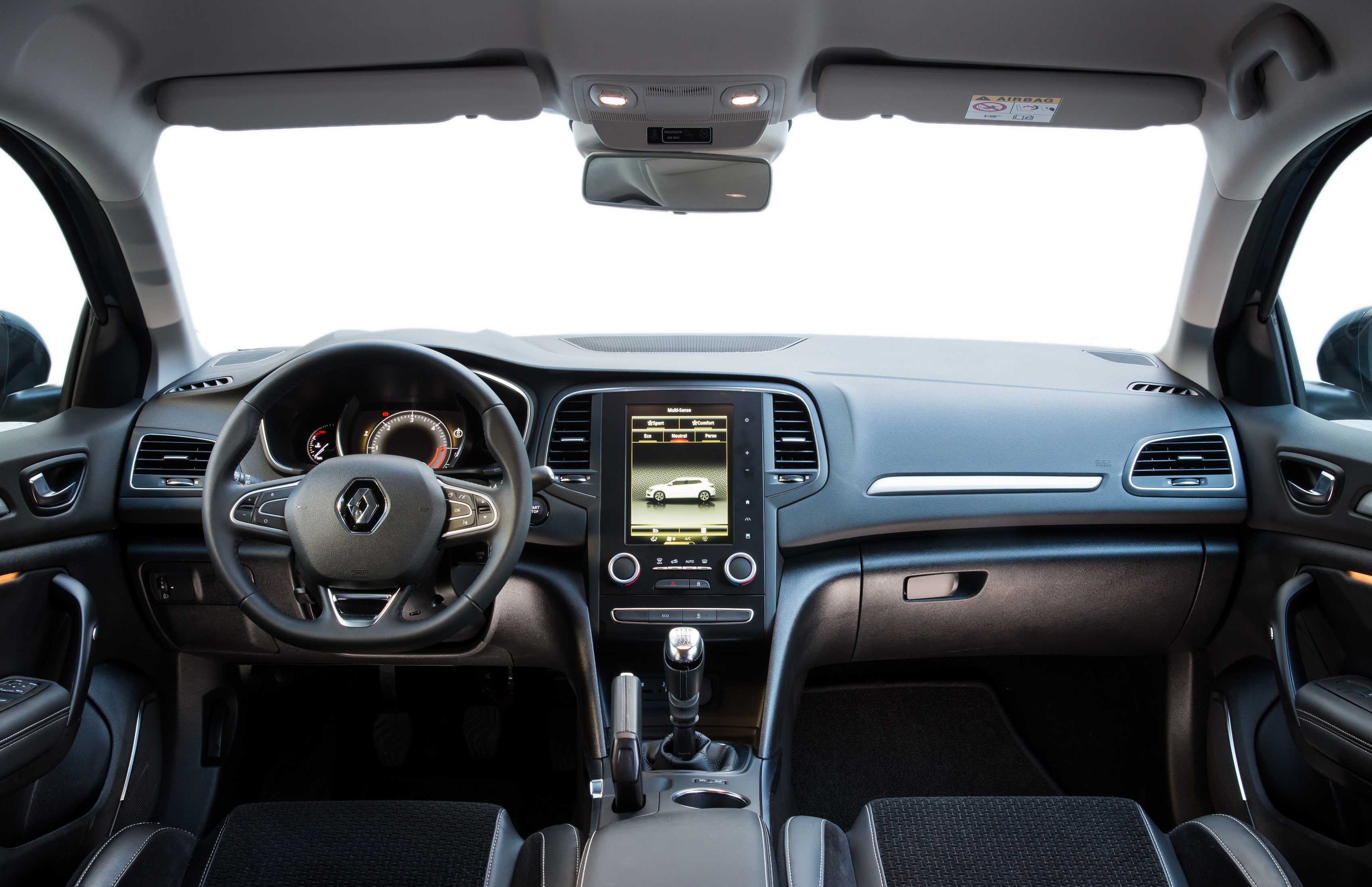Η σχεδιαστική ταυτότητα, λοιπόν, του Megane, αφενός αποτελεί μέρος της γλώσσας της Renault που εκφράζεται από Clio, Captur κλπ, και ταυτόχρονα προκρίνει το επιχείρημα πως η μικρομεσαία εμπορική ναυαρχίδα είναι ώριμη, premium, δυναμική, μα πάντα "διαφορετική". Για παράδειγμα, το εμπρός μέρος με τις χρωμιωμένες γρίλιες και το μυώδες καπώ αποπνέει κύρος, ενώ ταυτόχρονα τα φώτα με το χαρακτηριστικό C σχήμα το διαφοροποιούν. Οι φαρδιοί ώμοι και τα λαξεύματα στο ύψος του κατωφλιού των θυρών του δίνουν μια στιβαρή στάση στο δρόμο, σαν έναν ζεν πολεμιστή που έχει πάρει βαθιά ανάσα πριν σε τσακίσει ευγενέστατα.