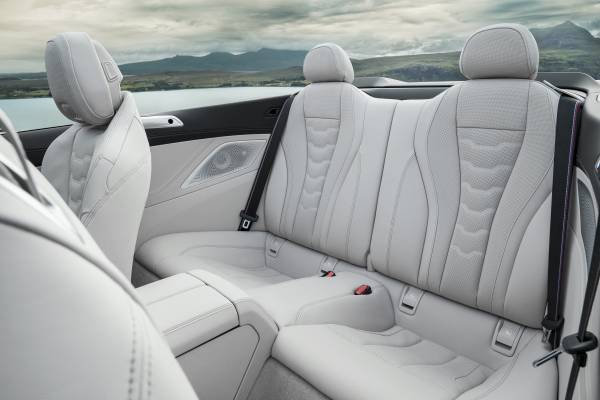 Ηλεκτρικά ρυθμιζόμενα σπορ καθίσματα με λειτουργία μνήμης και δερμάτινη ταπετσαρία Vernasca στάνταρ στην BMW 840d xDrive Cabrio. Η BMW M850i xDrive Cabrio είναι στάνταρ εξοπλισμένη με καθίσματα πολλαπλών ρυθμίσεων και δερμάτινη ταπετσαρία Merino με ιδιαίτερα χαρακτηριστικά. Γραμμές και επιφάνειες με διαμήκη προσανατολισμό, οδηγοκεντρικό cockpit και σαφής διάταξη χειριστηρίων ενισχύουν την επικέντρωση στη δυναμική, οδηγική εμπειρία. Υλικά υψηλής ποιότητας, φωτισμός εσωτερικού που προάγει την αίσθηση της φινέτσας. Πίνακας οργάνων και ώμοι παραθύρων με πλήρη δερμάτινη επένδυση, στάνταρ.