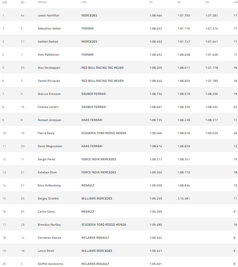 Φαίνεται πως ο Lewis Hamilton είναι ασταμάτητος. Τι και αν κατέκτησε τον τίτλο οδηγών στον προηγούμενο αγώνα, δείχνει πως τίποτα δεν τον σταματά. Ακόμα και ο Vettel, αποδείχθηκε ακόμα μια φορά λιγότερο ανταγωνιστικός γράφοντας τον 2ο χρόνο. Η βροχή που θεωρητικά θα μπορούσε να ανατρέψει το αποτέλεσμα τελικά περιορίστηκε μόνο σε ψιχάλες. Στην 3η θέση ο δεύτερος οδηγός της Mercedes, ο Valtteri Bottas ενώ στην τέταρτη θέση βρέθηκε η 2η Ferrari με τον Raikkonen. Η μάχη γα το πρωτάθλημα κατασκευαστών που δεν έχει κριθεί ακόμα κρατά τις δυο κορυφαίες ομάδες ακόμα σε πολύ υψηλή εγρήγορση. Στην 5η θέση βρέθηκε ο ταλαντούχος Max Verstappen. Ο αγώνας θα πραγματοποιηθεί αύριο στις 19:10.
