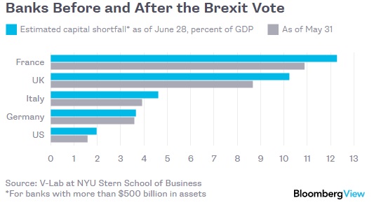 Ακόμη και πριν από το Brexit, το μοντέλο υπέθετε ότι οι τράπεζες ήταν πολύ πιο εύθραυστες από ό,τι άφηναν να εννοηθεί τα stress tests. Στις 31 Μαΐου εκτιμούσε ότι οι μεγαλύτερες τράπεζες στις ΗΠΑ, στο Ηνωμένο Βασίλειο, την Γερμανία, τη Γαλλία και την Ιταλία (εκείνες με περισσότερα από 500 δισ. δολάρια σε assets), θα είχαν ένα συνολικό έλλειμμα κεφαλαίου ύψους 998 δισ. δολαρίων.