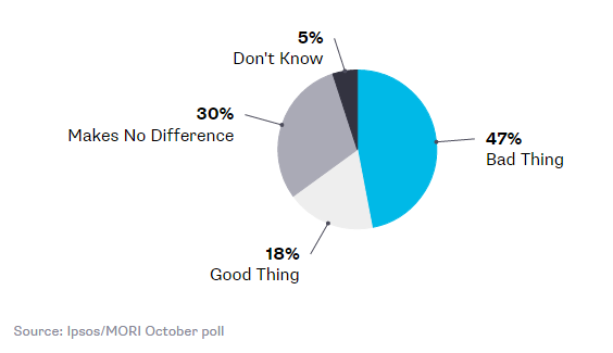 Μια δημοσκόπηση που διενεργήθηκε νωρίτερα αυτό το μήνα από την Ipsos MORI δείχνει πως σχεδόν οι μισοί ψηφοφόροι θεωρούν πως η κατάστασή τους θα χειροτερέψει μετά το Brexit, έναντι λιγότερων από 1/3 που το πίστευαν πριν την ψηφοφορία: