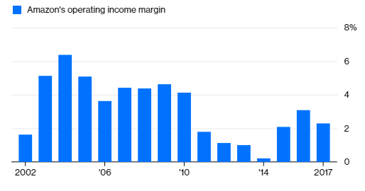 Ακόμη και η αγορά μιας αλυσίδας σούπερ μάρκετ πέρυσι πιθανότατα ενίσχυσε τα ευρέως γνωστά ως "μικροκαμωμένα" περιθώρια κέρδους της Amazon. Το λειτουργικό περιθώριο κέρδους της εταιρείας στο β' τρίμηνο (5,6%) ήταν το υψηλότερο σε διάστημα 13 ετών, και αυτό οφείλεται σε μεγάλο βαθμό στην είσοδο της Amazon σε επιχειρήσεις που αρχικά έμοιαζαν με παράξενους και δαπανηρούς αντιπερισπασμούς.