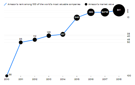 Η χρηματιστηριακή αξία της Amazon ξεπέρασε την Τρίτη προσωρινά το 1 τρισ. δολάρια. Είναι ένα ήσσονος σημασίας ορόσημο που μάλιστα δεν απαντάται για πρώτη φορά, αλλά ταυτόχρονα ένα αξιοσημείωτο σύμβολο για μια εταιρεία που μέχρι πρόσφατα μετά βίας έμοιαζε με γίγαντα που θα έσειε τον κόσμο. Η κεφαλαιοποίηση της Amazon είναι έξι φορές υψηλότερη σε σχέση με το 2014, που αντιστοιχεί σε αύξηση 840 δισ. δολαρίων. Η Google χρειάστηκε 14 χρόνια για να φτάσει αυτή τη χρηματιστηριακή αξία, ενώ η Amazon την συγκέντρωσε μέσα σε μόλις τέσσερα χρόνια.