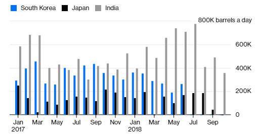 Με την προθεσμία του Νοεμβρίου να πλησιάζει στη λήξη της, κατέστη σαφές ότι οι αγοραστές που συμφώνησαν να περιορίσουν τις αγορές ιρανικού πετρελαίου μπορεί να είναι σε θέση να εξασφαλίσουν απαλλαγή από τις κυρώσεις. Τον Αύγουστο, ο σύμβουλος εθνικής ασφάλειας του Trump, John Bolton, είπε ότι οι χώρες αυτές θα είναι ελάχιστες. Την εβδομάδα που πέρασε, μαθεύτηκε ότι οι ΗΠΑ έχουν συμφωνήσει να αφήσουν οκτώ χώρες να συνεχίσουν να αγοράζουν πετρέλαιο του Ιράν.