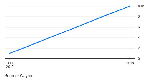 Πήρε στην Waymo της Alphabet έξι χρόνια για να διανύσει 1 εκατομμύριο μίλια χωρίς οδηγό. Στη διάρκεια του 2018, διένυε την ίδια απόσταση κάθε έναν ή δύο μήνες.