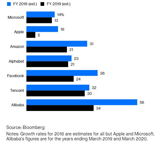 Οι ρυθμοί ανάπτυξης αναμένεται να επιβραδυνθούν σημαντικά για κάποιες από τις τεχνολογικές υπερδυνάμεις του κόσμου. Η εκτιμώμενη ανάπτυξη των εσόδων: