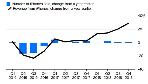 Η ερευνητική εταιρεία IDC εκτιμά ότι οι παγκόσμιες πωλήσεις smartphones μειώθηκαν ελαφρώς το 2018, όπως έκαναν και το 2017. Η Apple φαινόταν να μην επηρεάζεται από αυτή την κάμψη στην αγορά των smartphones για μεγάλο χρονικό διάστημα, ωστόσο δεν έγινε έτσι. Στο έτος χρήσης που έληξε τον Σεπτέμβριο, η Apple ίσα που πώλησε περισσότερα iPhones από ό,τι το προηγούμενο έτος. Τα έσοδα αυξήθηκαν επειδή η Apple χρέωσε υπερβολικά ακριβά το iPhone X και άλλα νέα μοντέλα - και οι πιστοί οπαδοί της εταιρεία πλήρωσαν τις υψηλότερες τιμές. Αλλά υπάρχει ένα όριο στο πόσοι άνθρωποι είναι πρόθυμοι να πληρώσουν 1.000 δολάρια για ένα νέο τηλέφωνο, και φαίνεται ότι η Apple έφτασε αυτό το όριο απότομα.