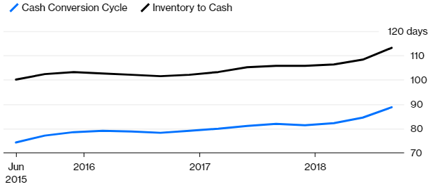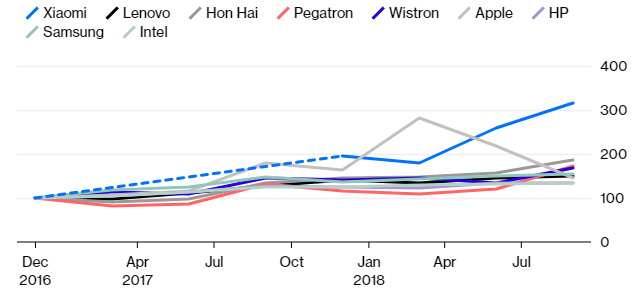 Η κινεζική νέμεσις του αμερικανικού κολοσσού, η Xiaomi Corp., θα μπορούσε να βρεθεί σε δύσκολη θέση. Έως τα τέλη Σεπτεμβρίου, η κατασκευάστρια των smartphones είχε αυξήσει τα αποθέματά της κατά 62% από τον Δεκέμβριο του 2017 και κατά 22% από τις 30 Ιουνίου Παρότι μπαίνετε στον πειρασμό να αγνοήσετε την κίνηση αυτή ως εποχική ενίσχυση των αποθεμάτων, η αύξηση των 5,3 δισ. γουάν ($770 εκατ.) των αποθεμάτων κατά τη διάρκεια αυτής της περιόδου υπερβαίνει την αύξηση των πωλήσεων hardware κατά 4,9 δισ. γουάν.