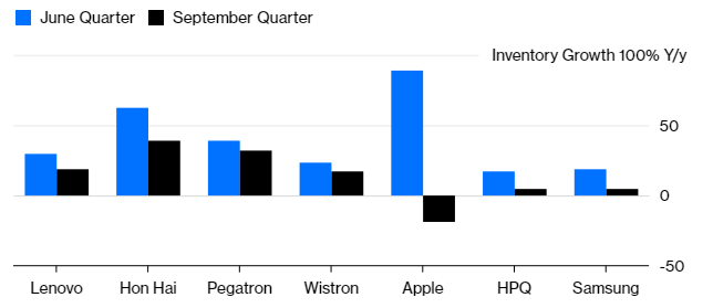 Τα αποθέματα συνέχισαν να αυξάνονται μέχρι τον Σεπτέμβριο. Η Apple ήταν η μόνη που πάτησε φρένο