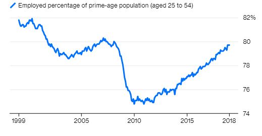 Η απόδοση της Fed στην απασχόληση δεν ήταν πολύ καλύτερη. Ισχύει ότι το ποσοστό ανεργίας κυμαίνεται κοντά σε χαμηλά επίπεδα πολλών δεκαετιών. Αλλά υπολογίζει μόνο εκείνους τους ανθρώπους που αναζητούν ενεργά εργασία. Ένα ευρύτερο μέτρο -το ποσοστό των εργαζομένων ώριμης ηλικίας με θέσεις εργασίας- παρουσιάζει μια διαφορετική εικόνα. Διαμορφώνεται χαμηλότερα από τα υψηλά του 2000 και του 2007 για περισσότερο από 10 χρόνια: