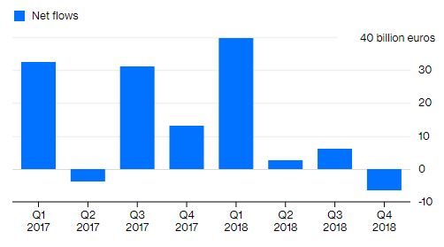 Οι καθαρές εκροές ύψους 6,5 δισ. ευρώ στο τελευταίο τρίμηνο του περασμένου έτους φαίνονται πολύ μικρές μπροστά στις απώλειες ύψους σχεδόν 44 δισ. ευρώ της αγοράς εν μέσω βουτιάς των ανά τον κόσμο αγορών μετοχών. Στα τέλη του 2018, τα υπό διαχείριση πάγια της Amundi έμειναν σχεδόν αμετάβλητα στα 1,4 τρισ. ευρώ.