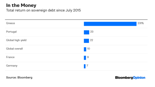 Το ελληνικό χρέος αποδείχθηκε ο "φωτεινός σηματοδότης" της ανθεκτικότητας της ΕΕ σε μια περίοδο απελπισίας που επιτάθηκε από την ψηφοφορία του 2016 υπέρ του Brexit. Οι διαχειριστές κεφαλαίων από το Βέλγιο, τον Καναδά, τη Γαλλία και την Ιταλία συνέρρευσαν, με την Prudential Financial Inc. να γίνεται ο μεγαλύτερος κάτοχος ελληνικών ομολόγων με 7,2 δισ. ευρώ, ήτοι το 9,5% του συνολικού υφιστάμενου χρέους.