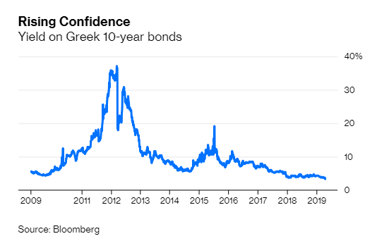 Καμία από τις μεγάλες ευρωπαϊκές χώρες δεν αναπτύσσεται τόσο γρήγορα όσο στις αρχές του νέου αιώνα. Η Ελλάδα δεν αποτελεί εξαίρεση και υπέστη τη χειρότερη συρρίκνωση της οικονομικής δραστηριότητας το 2012, με την ανεργία να εκτοξεύεται στο επίπεδο-ρεκόρ του 27,7% ένα χρόνο αργότερα. Για τους επενδυτές, αυτή ήταν η πιο ευνοϊκή ευκαιρία αγοράς. Η ανάκαμψη του ΑΕΠ έκτοτε υπερέβη αυτή της Γερμανίας και της Γαλλίας, με τον προβλεπόμενο ρυθμό 1,9% της επέκτασης της Ελλάδας το 2019, να την τοποθετεί στο στο Νο 10 μεταξύ των χωρών με την ταχύτερη ανάπτυξη και σημαντικά υψηλότερα σε σχέση με τον αναμενόμενο μέσο ότι της ευρωζώνης στο 1,4%, σύμφωνα με 21 οικονομολόγους της Bloomberg .