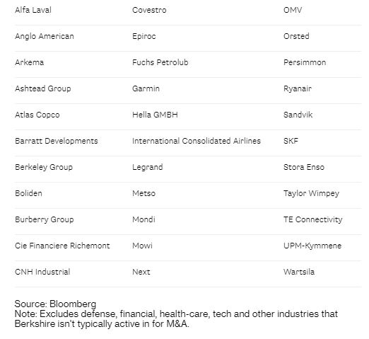 Προσπαθήσαμε να εντοπίσουμε πιθανές υποψήφιες ευρωπαϊκές εταιρείες για εξαγορά, συγκεκριμένα εκείνες με κεφαλαιοποίηση από 5 δισ. δολ. έως 50 δισ. δολ., που ταιριάζουν στο προφίλ των εξαγορών του Buffett στις ΗΠΑ. Μεταξύ των ονομάτων που αναδύονται είναι η Atlas Copco AB, ένας σουηδικός κατασκευαστής βιομηχανικών εργαλείων, η Metso Oyj, φινλανδικός κατασκευαστής εξοπλισμού εξόρυξης, η Mondi Plc, μια αυστριακή εταιρεία συσκευασίας και χαρτιού και η Ryanair Holdings Plc, η ιρλανδική αεροπορική εταιρεία. Πέρα από τις οικονομικές τους μετρήσεις, δεν ταιριάζουν αναγκαστικά όλες οι επιχειρήσεις στο προφίλ των εξαγορών στις ΗΠΑ και είναι πολύ διαφορετικές μεταξύ τους - είναι σίγουρα δύσκολο να φανταστεί κανείς ότι ο Buffett θα αγόραζε για παράδειγμα τη Burberry. Αλλά είναι πάντα ενδιαφέρον να δει κανείς ποιες εταιρείες φαίνεται να έχουν τα χαρακτηριστικά γνωρίσματα ενός στόχου για τον Buffett: